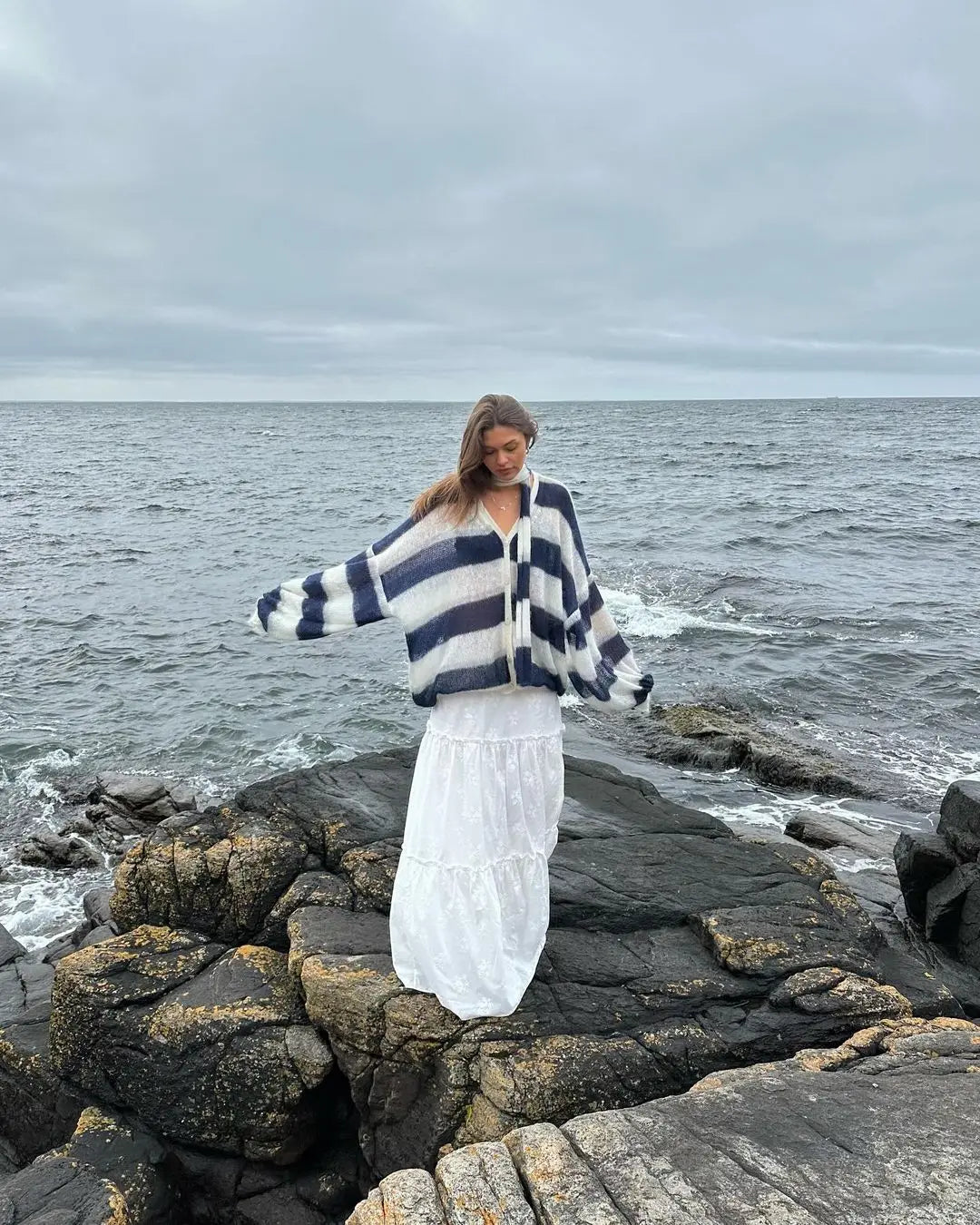 Stay cozy and cute in this navy and white striped V-neck sweater, paired with an adorable matching scarf for the perfect finishing touch!