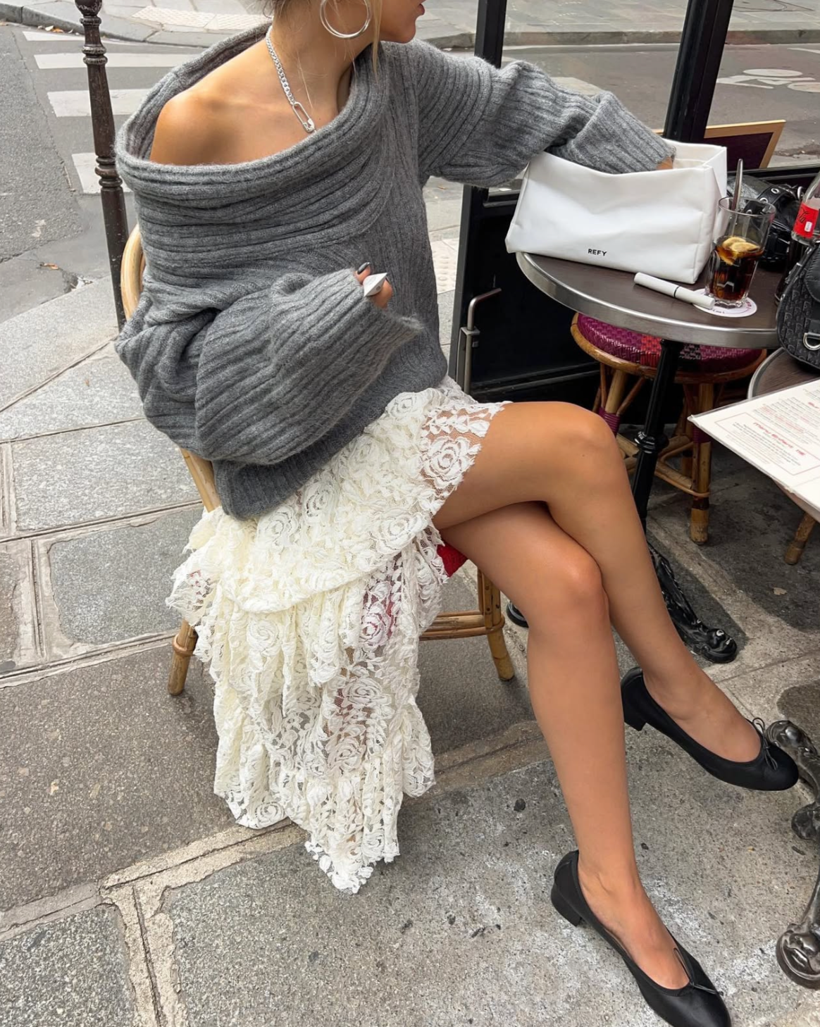 An ultra-stretch oversized pullover featuring an exaggerated drop shoulder and extended elongated sleeves. Designed with bold rib knitting and a high roll neckline that can be styled off the shoulder for versatility.