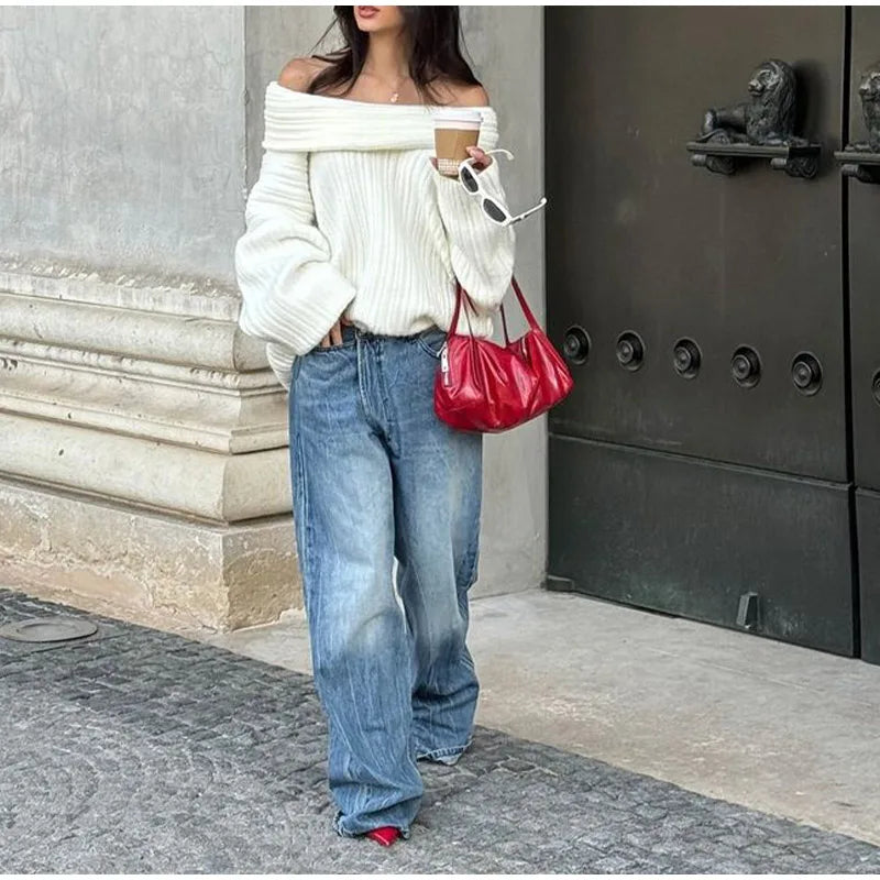 An ultra-stretch oversized pullover featuring an exaggerated drop shoulder and extended elongated sleeves. Designed with bold rib knitting and a high roll neckline that can be styled off the shoulder for versatility.